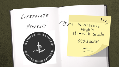 Lifepointe's youth group for 6th through 12th graders meets every Wednesday nights from 6:30-8:30pm at Lifepointe Church. All are welcome to join us for a Bible study, along with food and a fun night.